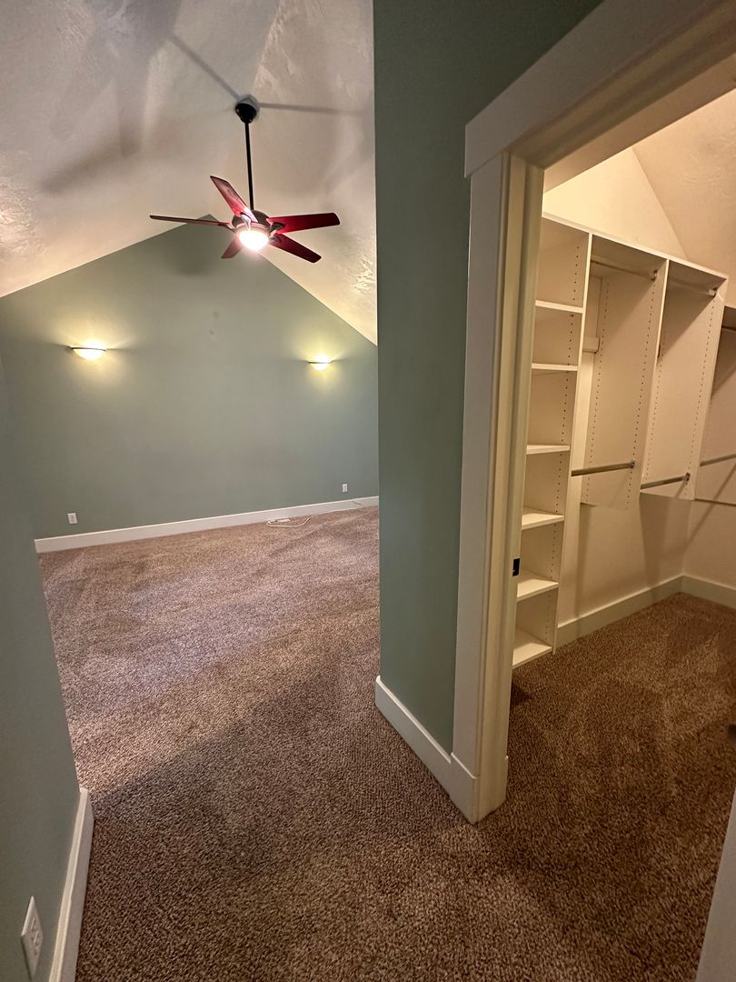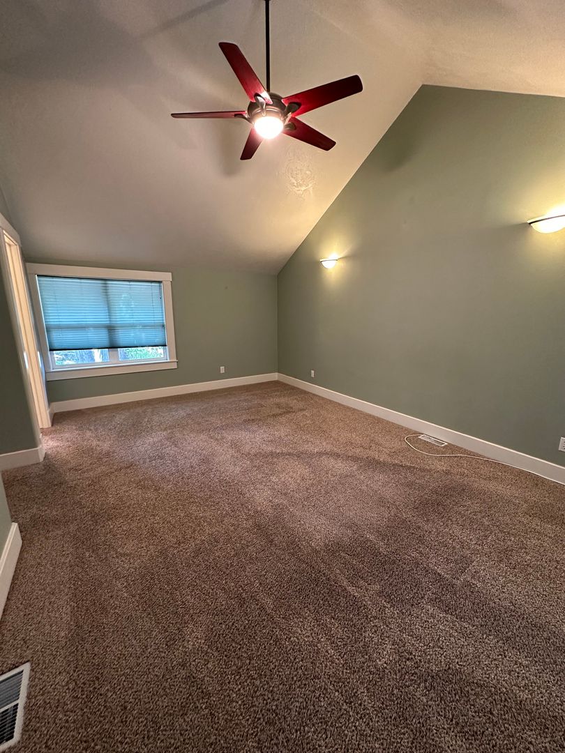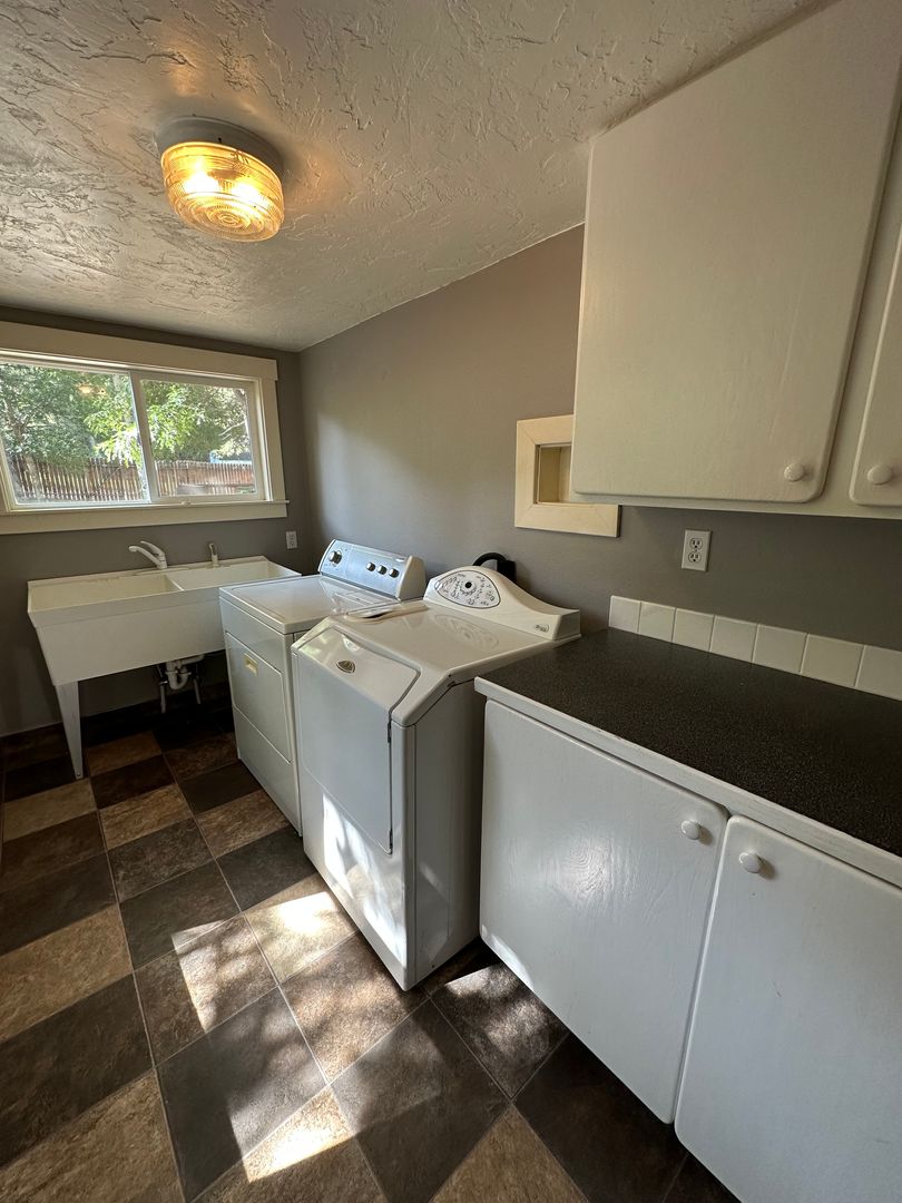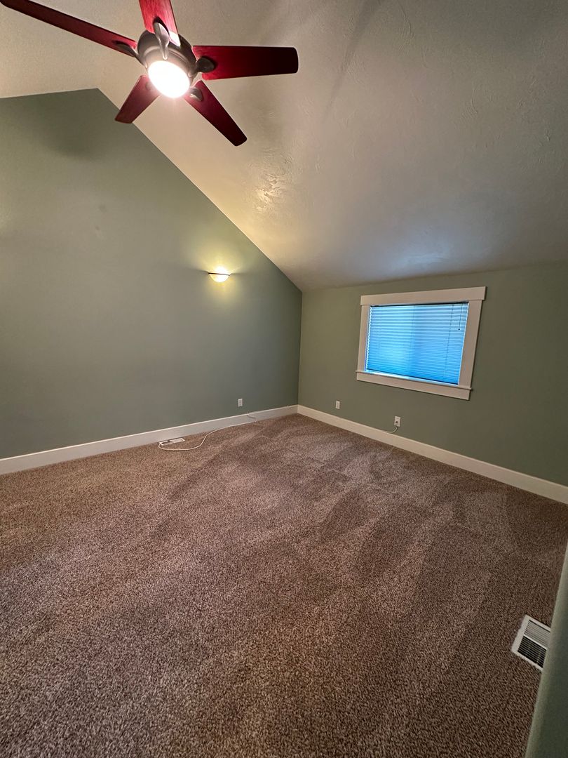 The master bedroom boasts vaulted ceilings and a ceiling fan for added comfort. Its large closet features built-in shelves, providing ample storage space. A dedicated laundry room offers washer and dryer hookups, along with a folding cabinet and a large basin sink. Plus, there's an additional room in the basement, perfect for storage, a home office, or extra living space.